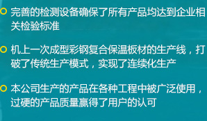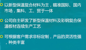 公司是一家瞄準(zhǔn)國際、國內(nèi)市場(chǎng),集科、工、貿(mào)于一體的綜合性公司,擁有各類先進(jìn)的設(shè)備100余臺(tái)(套),公司自主研發(fā)了新型保溫材料及彩鋼復(fù)合保溫板材連續(xù)生產(chǎn)工藝,建成了機(jī)上一次成型彩鋼復(fù)合保溫板材的生產(chǎn)線...